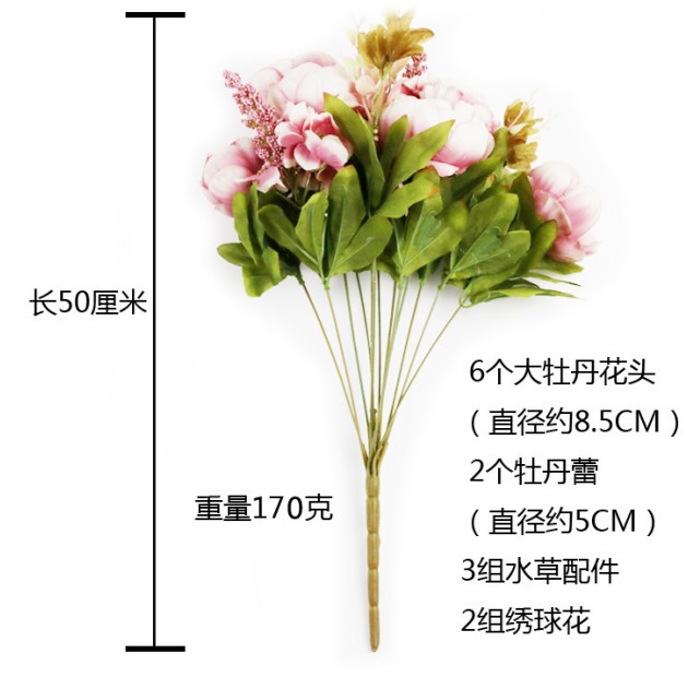 Size:L: 49cm,6 Big poney(8.5cm)+2 poney buds(5cm)+2 Hydrangea +3 plants